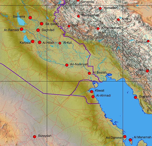 Detail of the same map showing Northern Persian Gulf including Iraq, Kuwait, Saudi Arabia and Iran.