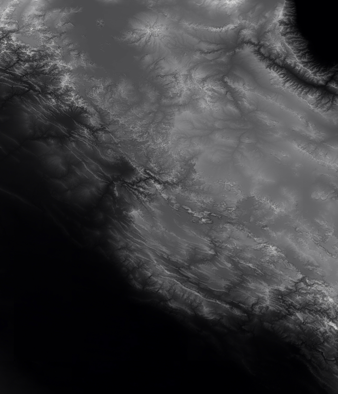 ![]() Sample area of Eastern Iraq Full map 35º East to 52º East, 24º North to 40º North Includes parts of Saudi Arabia, Iran, Israel, Lebanon, Jordan, Turkey and Kuwait For full area coverage of this map see Full map File sizes: Relief map decompressed 44 MB, JPEG 4 MB Dimensions 4,075 X 3,831 pixels (40 X 38 inches at 100 dpi) Features JPEG relief map in 255 graduation of grayscale based on elevation Black at sea level, white is highest mountain elevation